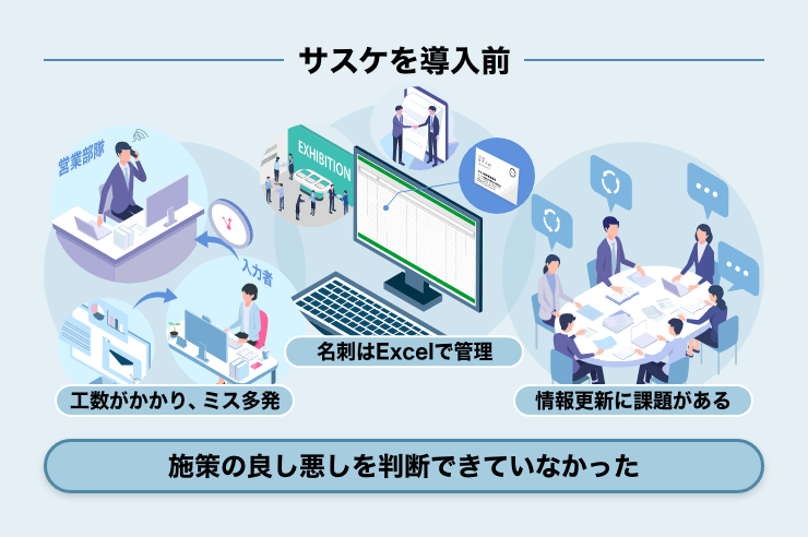 また、製品PRのために外部の展示会へ年3,4回ほど出展しています。会期中に獲得した名刺も、Excelへ一覧化する状態が続いていました。取りまとめたExcelの情報をもとに、各営業所ごとでフォローアップを行っていましたが、情報の更新に手間がかかるのが悩みの種でしたね。その上、なかなか現場から情報のフィードバックもなされないため、効果測定もできず「出展して良かったのか・悪かったのか」も判断できない状況が続きました。