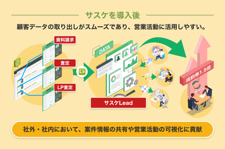 サスケ導入後、「歩留まり改善プロジェクト」の様々な施策の積み重ねもあり、プロジェクト前後比較で、成約率が1.5倍に向上しました。